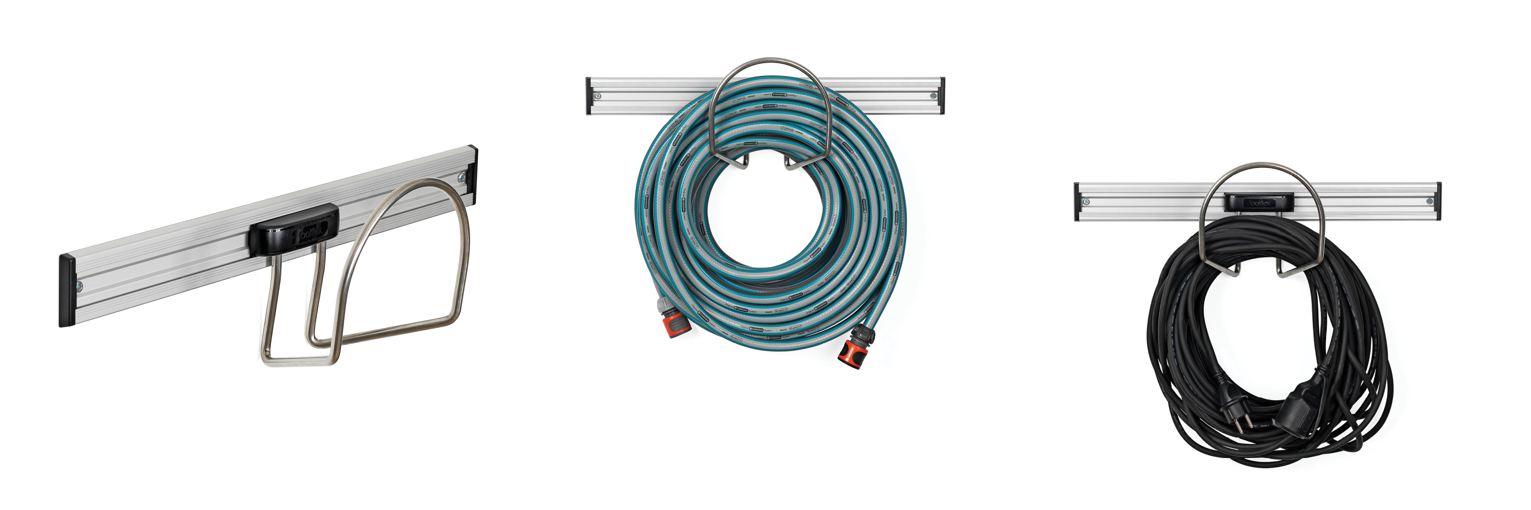 Toolflex Multifix kann an der Toolflex Aluminium Schiene oder einzeln an der Wand montiert werden. Toolflex Multifix ist ideal zum Aufbewahren von Kabeln, Schläuchen, Saugrohren etc.